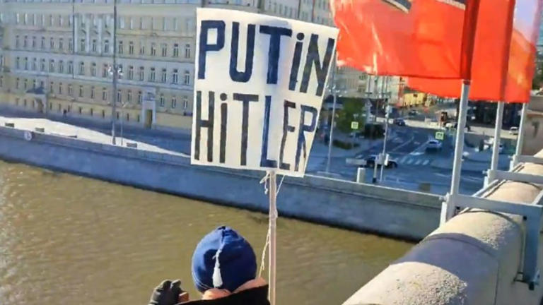 A pochi giorni dalla festa del 9 maggio, un moscovita ha inscenato una performance provocatoria sul ponte Moskvoretsky, a poca distanza dal Cremlino: davanti ai passanti, ha esposto un cartello che accostava Vladimir Putin ad Adolf Hitler, per poi gettarsi nel fiume Moscova fingendosi morto.