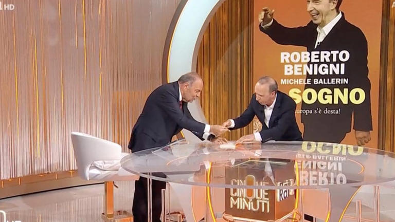 Roberto Benigni non si è lasciato scappare l'occasione di fare show anche nei 'Cinque Minuti' di Bruno Vespa. L'attore, ospite della trasmissione in onda su Rai1, ha fatto un intervento legato al lancio del suo libro in uscita il prossimo 17 giugno, dedicato all'Europa e intitolato Il Sogno, come lo spettacolo andato in onda per la serata evento dello scorso marzo.