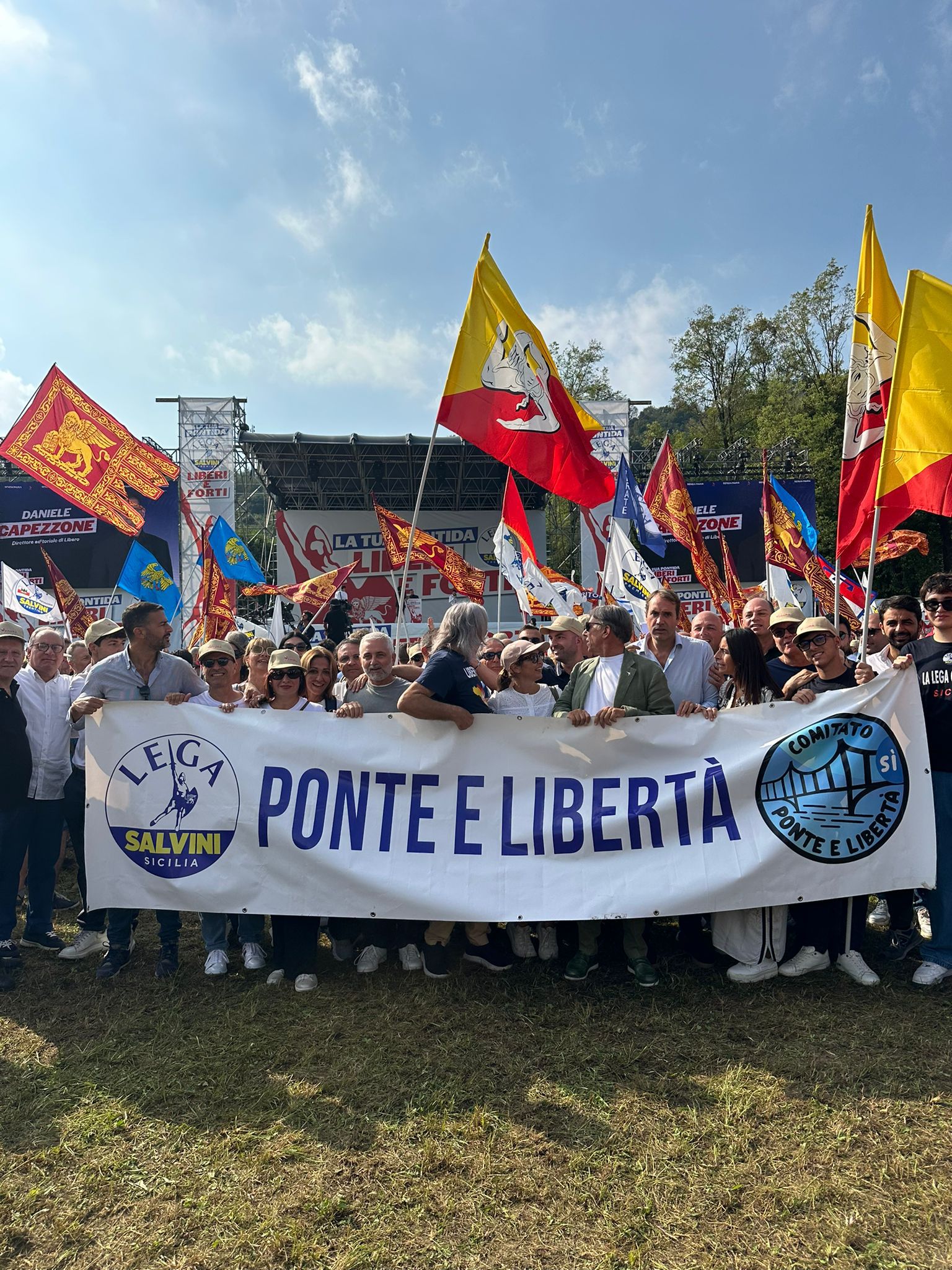 C'è anche un modellino del ponte sullo Stretto nel nello stand della Lega Sicilia sul pratone di Pontida, in occasione dell’evento attuale del partito di Matteo Salvini. Un gruppo di siciliani, tra deputati nazionali, senatori, parlamentari regionali, europarlamentari e militanti ha già raggiunto la cittadina del bergamasco. In prima fila il segretario regionale Nino Germanà, con l’assessore regionale in pectore Luca Sammartino, che la prossima settimana tornerà nella giunta siciliana guidata da Schifani.