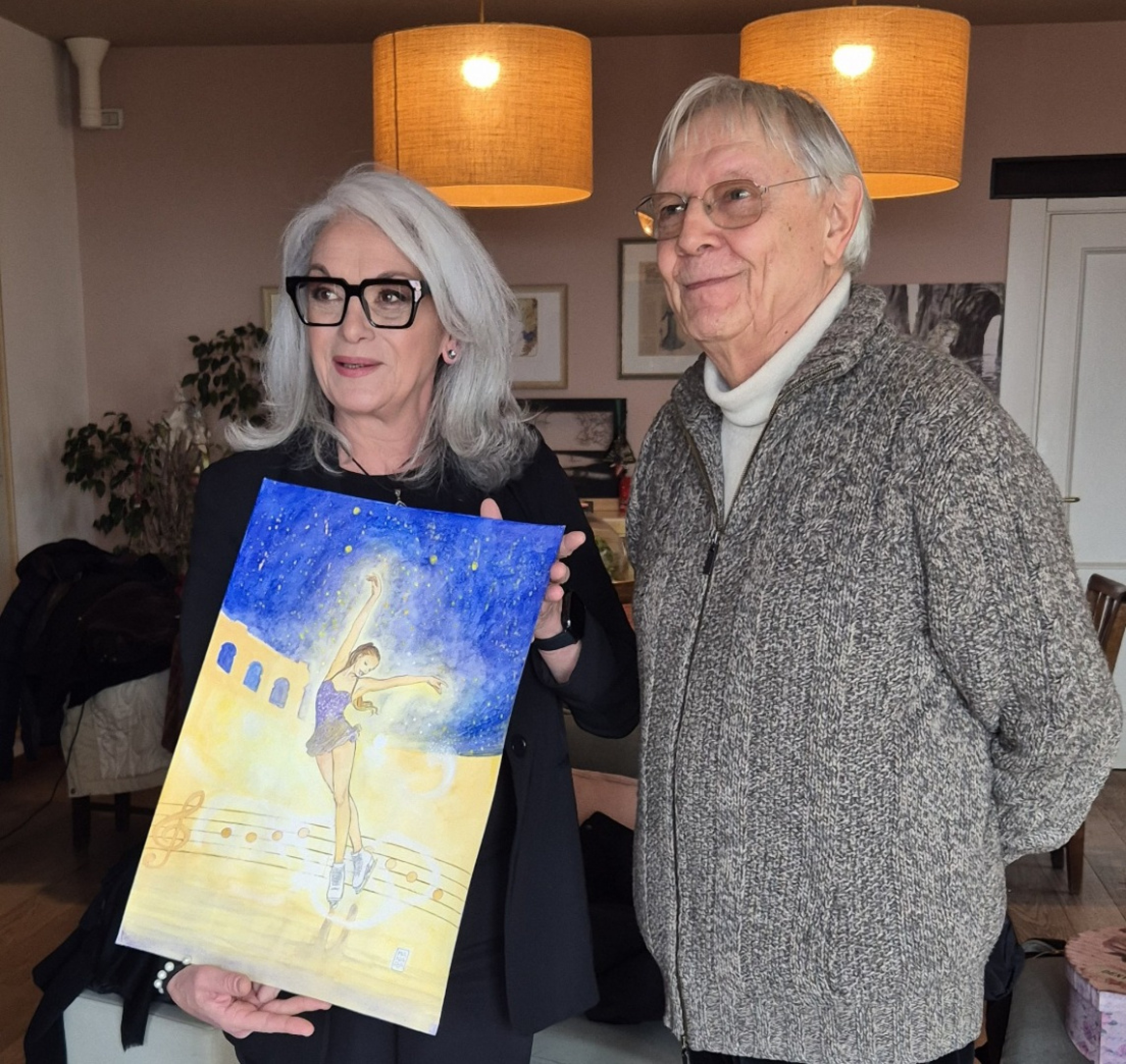 Al centro del disegno una pattinatrice che danza sulle note dell'Inno alla Gioia di Beethoven, evocato da un pentagramma che si muove nello spazio, mentre l'Arena emerge come presenza iconica. Un incontro tra discipline diverse unite dalla ricerca della bellezza, dell'armonia e dell'emozione dal vivo: la musica, lo sport, lo spettacolo. E il cielo porta i colori giallo e blu della città di Verona.